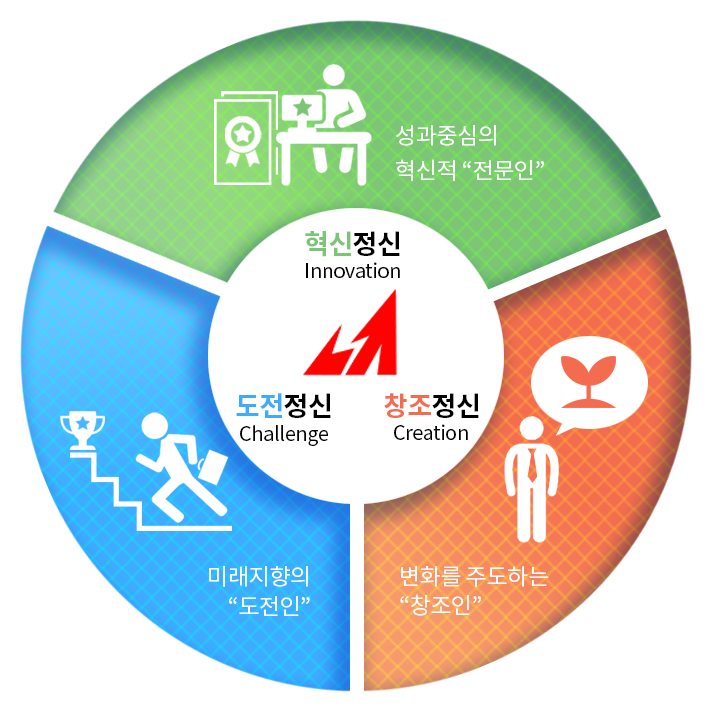 미래지향 도전하는 사람, 성과중심 혁신적인 사람, 변화주도 창조적인 사람으로 정립합니다.